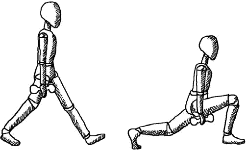 7. ИП: стоя. Гантели – в разогнутых руках по бокам. Правой ногой сделать шаг вперед, корпус медленно опустить вниз, насколько это возможно. Спина прямая. Вернуться в ИП. В самом низком положении туловища при правильном выполнении упражнения колено должно располагаться над ступней. Это упражнение можно выполнять со штангой, которую располагают позади головы на плечах. Упражнение развивает силу бедра и голени (рис. 6.12).