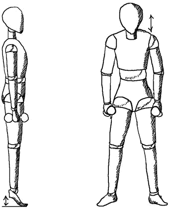 10. ИП: стоя. Руки с гантелями расположены вдоль туловища, ноги на ширине плеч. Подняться на носки, а затем медленно опуститься на всю ступню. Плечи расслаблены. Упражнение способствует укреплению икроножных мышц (рис. 6.15).
