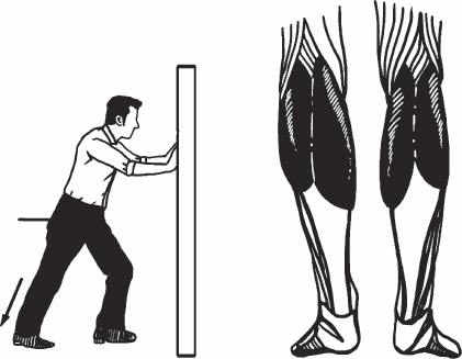 Задняя нога должна быть прямая в колене. В икре должно быть ощущение растяжения (см. рис. 57). Делать упражнение нужно до тех пор, пока в самом крайнем положении вы не будете чувствовать натяжение в икре. На это уходит от 2 до 3 недель.