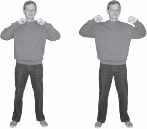 Исходное положение: руки согнуты перед грудью, тыльные части кулаков направлены кверху, локти чуть опущены вниз.