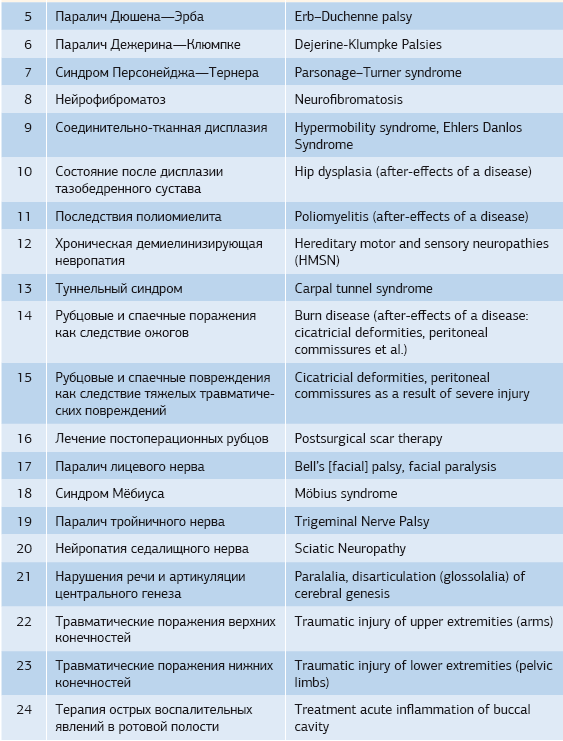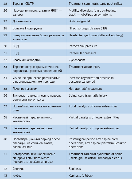 Таблица 1. Список основных диагнозов, при которых применялось кинезиотейпирование