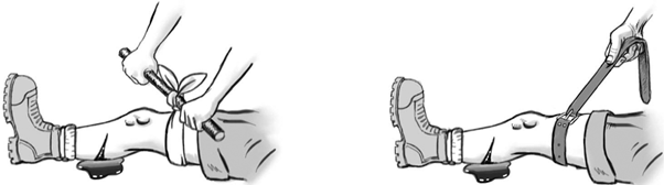2. Наложите жгут примерно на 5–7 см выше раны. Убедитесь, что жгут попадает на артерию: поврежденная артерия могла сократиться из-за спазма{28}.
