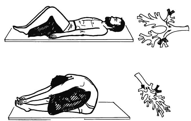 1. Если необходимо обеспечить отток мокроты в средней доле правого легкого, больной должен лежать на спине, подтянув к груди колени и откинув назад голову, или на животе и здоровом боку. Для левого легкого проделывается все то же самое, только на другом боку.