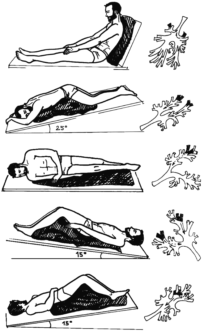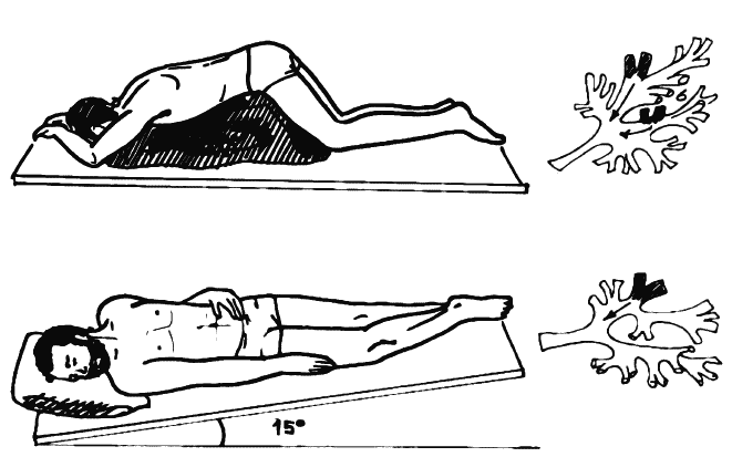 Перед началом занятия больного на 5–10 мин укладывают в так называемое дренажное положение. С каждым занятием время пребывания в дренажном положении должно постепенно уменьшаться.