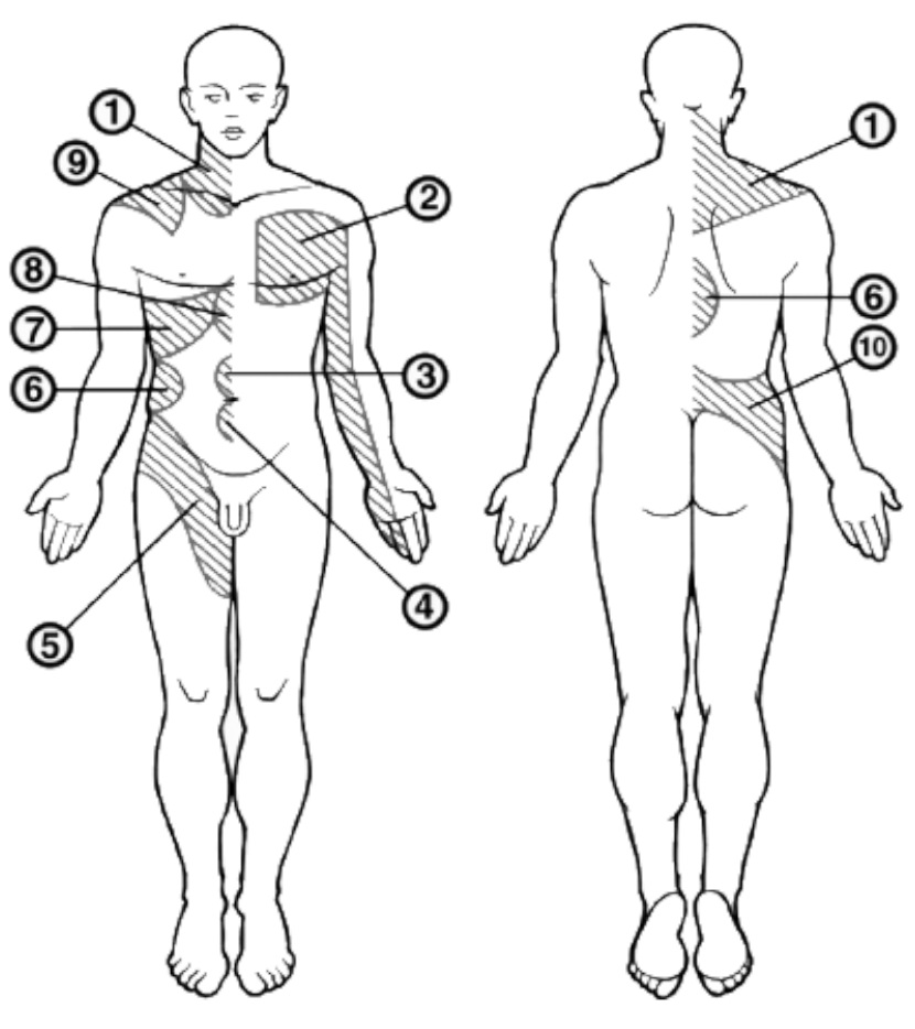 В указанных зонах могут появляться боль и гиперестезия при заболеваниях легких и бронхов (1), сердца (2), кишечника (3), мочевого пузыря (4), мочеточников (5), почек (6), печени (7 и 9), желудка и поджелудочный железы (8), мочеполовой системы (10).