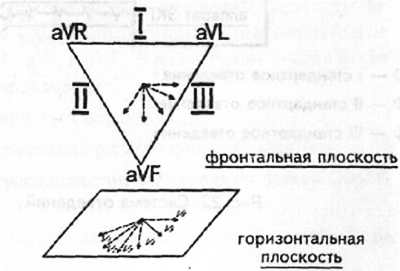 Ранее было отмечено, что грудные отведения записывают потенциалы сердца с иной эквипотенциальной поверхности, нежели стандартные и усиленные однополюсные отведения. Указывалось конкретно, что грудные отведения отображают изменение результирующего вектора возбуждения сердца не во фронтальной, а в горизонтальной плоскости.