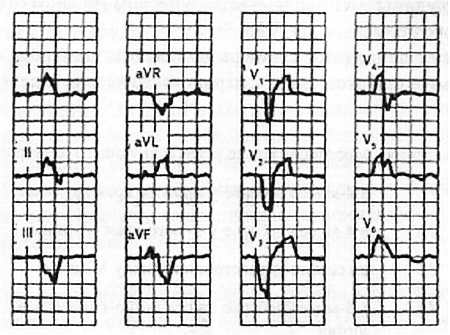 Таким образом, если на электрокардиографической ленте будут зарегистрированы отклонения от нормы в отведении V3, можно думать, что патология имеет место в межжелудочковой перегородке. Следовательно, большое разнообразие электрокардиографических отведений позволяет нам с большей степенью достоверности осуществлять топическую диагностику процесса, происходящего в том или ином участке сердца.