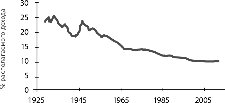Рис. 22. Процент располагаемого дохода, который уходил на приобретение продовольствия с 1929 по 2012 год. Данные предоставлены Службой экономических исследований при министерстве сельского хозяйства США.