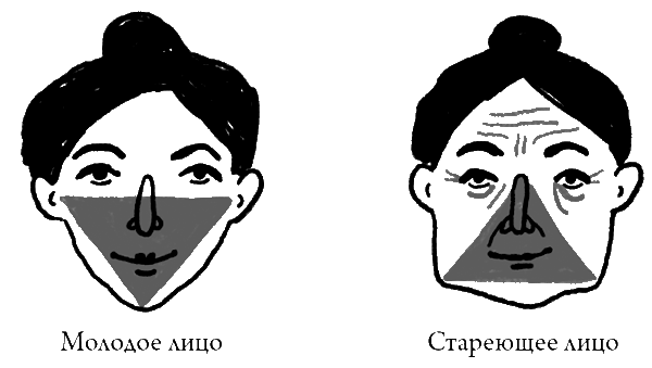 Свежее юное лицо без резких линий и морщин очаровательно благодаря жировой прокладке в нижнем слое кожи. Хорошо бы это сознавали молодые люди, одержимые манией похудения! Ведь именно жир придает лицу красоту и молодость. Жировые подушки на лице надежно упакованы в каркас из соединительной ткани. К сожалению, соединительная ткань с течением жизни тоже изнашивается, и жировые прослойки повисают мешками, причем в полном соответствии с законом всемирного тяготения, то есть по направлению вниз, к земле, когда человек стоит. Вдруг опадают щеки и впадают глаза. По сравнению с более молодой версией самого себя человек выглядит изможденным, вялым и уставшим. В юности лицо можно сравнить с треугольником, повернутым острием вниз, а с течением десятилетий треугольник поворачивается вниз основанием.