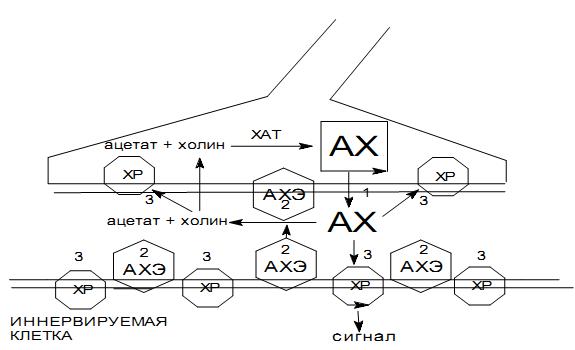 Рис. 1. Схема функционирования холинэргического синапса 1- АХ (ацетилхолин), 2- АХЭ (ацетилхолинэстераза), 3- ХР (холинорецептор)