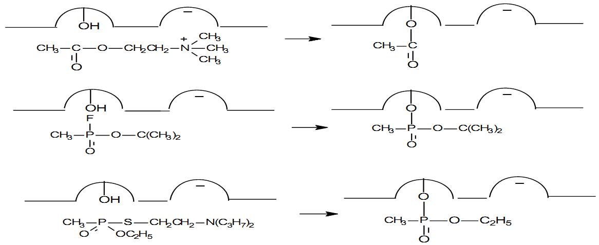 Взаимодействие между ФОВ и АХЭ является сложной многоступенчатой реакцией. Сначала образуется обратимый комплекс ФОВ с энзимом (ХЭ + ФОВ ХЭ • ФОВ), который существует считанные доли секунды, затем происходит фосфорилирование с образованием прочного фосфорилированного энзима и продукта реакции – остатка фосфорорганического ингибитора. Эта реакция протекает в течение 1,5 – 2 часов. Через 4–5 часов фосфорилированный энзим подвергается «старению», которое почти исключает возможность его дефосфорилирования (необратимое соединение). Эта реакция приводит к необратимому угнетению каталитической функции АХЭ, накоплению эндогенного АХ и непрерывному возбуждению холинореактивных систем организма.
