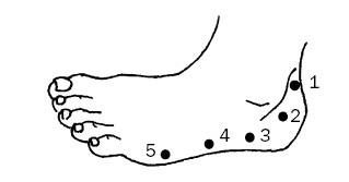 4. Книзу от головки 5-й плюсневой кости, на границе тыльной и подошвенной поверхности стопы можно простукивать лечебную зону (4) при заболеваниях позвоночника (напряжение в затылочных мышцах, боли в пояснице, спине, задней поверхности нижних конечностей, боль в тазобедренном суставе).