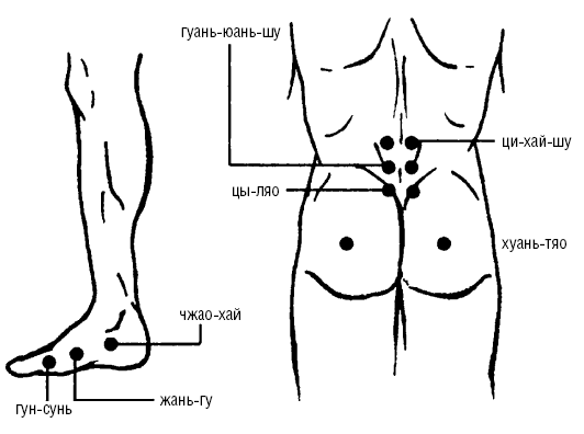 3. ЧЖАО-ХАЙ (R-6) находится вертикально вниз, на 1 цунь от нижнего края внутренней (медиальной) лодыжки голеностопного сустава.