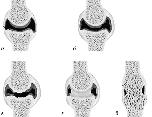 а – здоровый сустав; б – І стадия артрита; в – ІІ стадия артрита; г – ІІІ стадия артрита; д – ІV стадия артрита