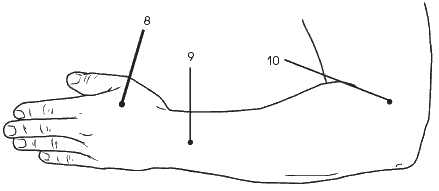 Точка 9. Симметричная точка, расположенная на внешней поверхности предплечья. Ее легко обнаружить в углублении, которое находится чуть выше верхней складки запястья. Массаж данной точки лучше всего проводить в положении сидя, расположив руку на столе таким образом, чтобы ладонь касалась его поверхности. Воздействие должно быть успокаивающим, поэтому нажимы следует выполнять плавно. Массировать точку следует попеременно сначала на правой руке, а затем – на левой.