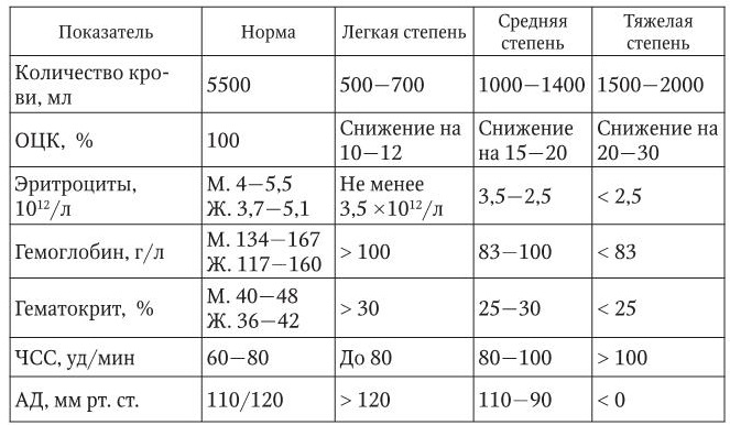 В табл. 2 приведены основные критерии определения степени кровопотери.