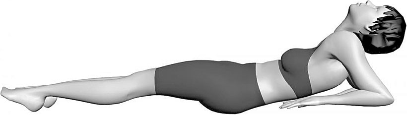 Голова по-прежнему лежит на «подставке» из сжатых трапеций. Живот провален. Выгибайтесь в грудном отделе, как будто под него подложен мяч, крестец прижат к поверхности, на которой вы лежите. Лопатками тяните спину вниз (рис. 99). Вы можете растягивать спину в этой позиции по ощущениям.