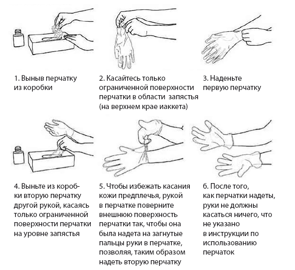 Не допускается использование одной и той же пары перчаток при контакте (для ухода) с двумя и более пациентами, при переходе от одного пациента к другому или от контаминированного микроорганизмами участка тела к чистому.