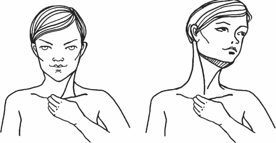 Исходное положение, как на рис. 38. Пальцами нажимаете на мышцу и производите наклоны головой. Во время упражнения должно чувствоваться натяжение мышцы от уха вниз, к пальцам. Выполнять по 10 повторов в каждую сторону 2 раза в день.