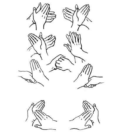 Скрестите пальцы руки обеих рук, энергично потрите ладони и внутренние поверхности пальцев движениями вверх и вниз в межпальцевых промежутках.