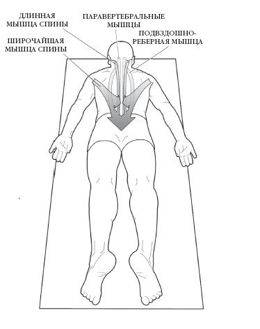 Разгибание грудопоясничного отдела осуществляется за счет двустороннего сокращения паравертебральных мышц, подвздошно-реберной мышцы, длинной мышцы спины и широчайшей мышцы спины.