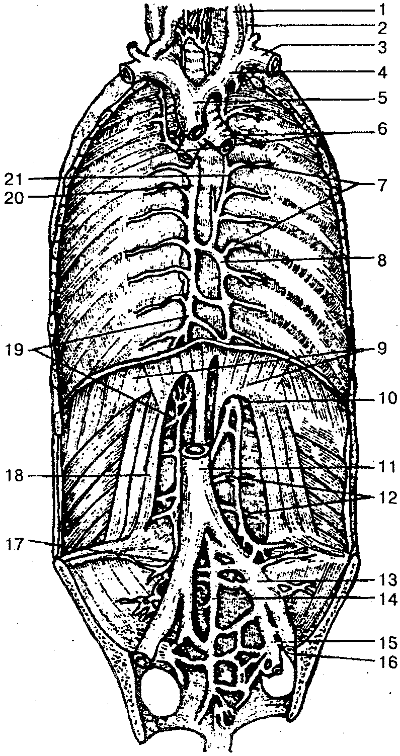 На уровне наружного края I ребра подмышечная вена переходит в подключичную. К ней присоединяются непостоянная поперечная вена шеи, подлопаточная вена, а также мелкие грудные и дорсальная лопаточная вена. Место слияния подключичной вены с внутренней яремной веной с каждой стороны называется венозным углом. В результате этого соединения формируются плечеголовные вены, куда впадают вены тимуса, средостения, околосердечной сумки, пищевода, трахеи, мышц шеи, спинного мозга и др. Далее, соединившись, плечеголовные вены образуют основной ствол — верхнюю полую вену. К ней присоединяются вены средостения, околосердечной сумки и непарная вена, которая является продолжением правой восходящей поясничной вены. Непарная вена собирает кровь от стенок брюшной и грудной полостей (рис. 95). В непарную вену впадает полунепарная вена, к которой присоединяются вены пищевода, средостения, частично задние межреберные вены; они являются продолжением левой восходящей поясничной вены.