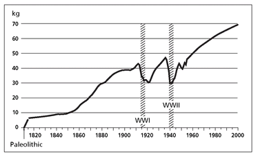 Рис. 8. Изменение потребления рафинированного сахара: 2 кг в год на человека в эпоху палеолита(когда формировалась наша генетическая структура); 5 кг в год в 1830 г.; 70 кг в год в 2000 г. (25).