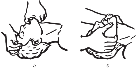 • открыть рот, осмотреть его полость и с помощью салфетки очистить от слизи, слюны, травы, песка, рвотных масс и т. д., вынуть съемные зубные протезы (рис. 15.2);