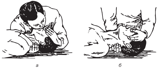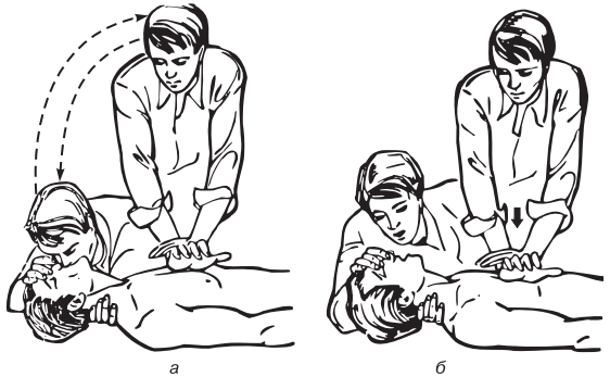 Рис. 15.7. Сердечно-легочная реанимация, проводимая: а — одним человеком; б — двумя