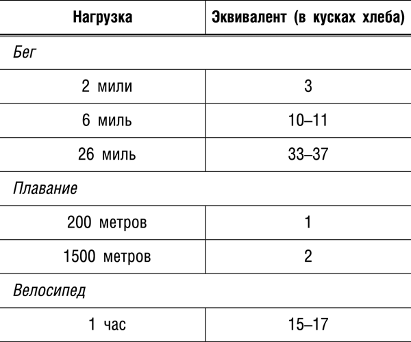 Наилучшим топливом для физических нагрузок являются углеводы. Как видно из таблицы энергетической ценности углеводов, чтобы пробежать 2 мили[5] требуется количество углеводов, содержащихся в трех кусках хлеба. Если вы регулярно ограничиваете себя в углеводной пище (картошке, хлебе и макаронах), а затем добавляете упражнения, вы организуете собственному телу дефицит углеводов. Если не кормить тело достаточным количеством углеводов, то для получения жизненной энергии оно примется расщеплять мышечный белок. Это было продемонстрировано даже при изучении выносливых спортсменов. Выносливые спортсмены, не получавшие достаточно углеводов для своих занятий, сжигали разветвленные аминокислоты (компонент белка), чтобы получить жизненную энергию для питания своих тел.