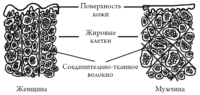 И у мужчин, разумеется, тоже есть подкожные жировые ткани. Но там волокна расположены не только вертикально. Мужикам посчастливилось иметь текстуру с диагонально и поперечно проходящими волокнами. Жировой слой пронизывает обширная сеть продольных и поперечных волокон, они плотно удерживают ткань и позволяют даже полноватому мужчине выглядеть подтянутым.