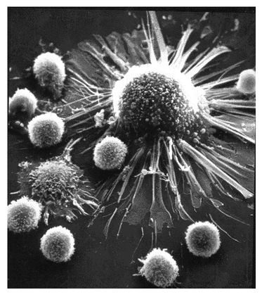 Рис. 15. Лейкоциты атакуют раковую клетку (более крупная). На их активность влияет наше эмоциональное состояние, а они, в свою очередь, влияют на работу мозга. Таким образом, клетки иммунной системы являются частью того, что доктор наук Кэндис Перт называет «подвижным мозгом».