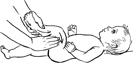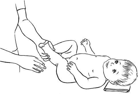 Возьмите в свои руки ножку ребенка, слегка приподняв ее в согнутом положении, поддерживайте ее (рис. 332).