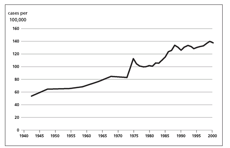Рис. 6. Рост заболеваемости раком груди в США с 1940 по 2000 год (число случаев на 100 000 человек с учетом среднего возраста населения) (3, 4)