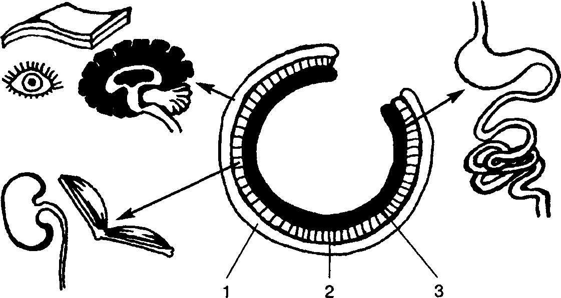 Три зародышевых листка и основные системы органов, образующиеся из них:1 – эктодерма; 2 – мезодерма; 3 – энтодерма