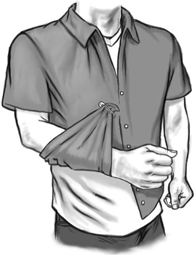 Для косыночной повязки подойдет любой прочный и гибкий материал. Сделать ее легко: достаточно обмотать подол рубашки вокруг руки и прикрепить его безопасными булавками к верхней части рубашки.