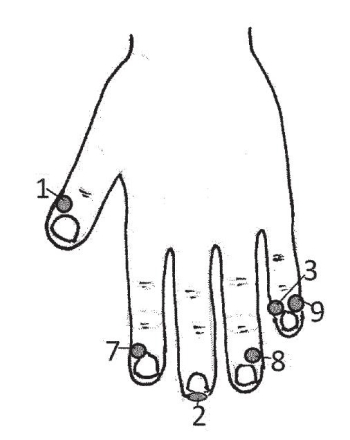 Зона 3 расположена на лучевой стороне мизинца, к углу ногтя (рис. 53, а). Традиционное назначение: лечение болезней сердца (сердцебиение, боль в области сердца); избавление от судорог мышц руки, боли в предплечье; лечение нервных расстройств; предупреждение критических состояний (высокая температура, потеря сознания).