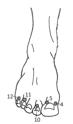 Зона 11 расположена на наружной стороне 4-го пальца стопы, ближе к углу ногтя (рис. 53, б). Традиционное назначение: избавление от головных болей, головокружения, боли в глазах (при мигрени), уменьшение шума в ушах из-за перепада давления; предупреждение нервных расстройств; лечение одышки и лихорадки.