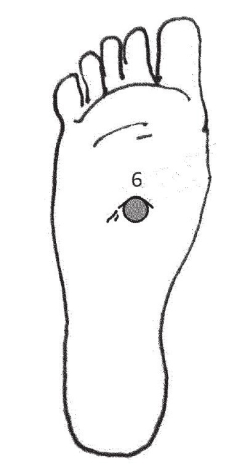 Зона 6 расположена в середине подошвы, между 2-й и 3-й плюсневыми костями, в углублении, образующемся при поджатии пальцев стопы (в углублении в середине подошвы, рис. 53, в). Зону отдельно используют в критических состояниях (отравление, судороги). А также при ломоте в суставах, головной боли, при сердцебиении, при нарушении работы почек, при нервных болезнях.