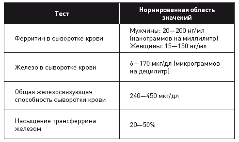 Самый важный анализ – это анализ на ферритин. Он измеряет концентрацию ферритина в крови. Два других лабораторных теста используются, чтобы сосчитать процент насыщения трансферрина железом: «железо в сыворотке крови» измеряет объем циркулирующего в организме железа, а «общая железосвязующая способность сыворотки крови» показывает способность молекул трансферрина к переносу железа (28).