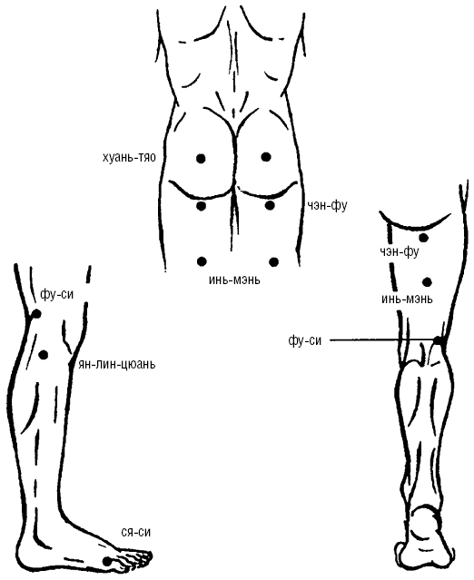 1. ХУАНЬ-ТЯО (VB-30) находится в центре ягодичной мышцы, при сгибании ноги в коленном суставе пятка проецируется на данную точку, или на 3 цуня за тазобедренным суставом.