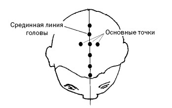 1. Надавливаем в течение 5 секунд на каждую из 6 точек заднесрединной линии, проходящей через макушку (рис. 33). Сделаем 3 прохода по указанным на рисунке точкам.