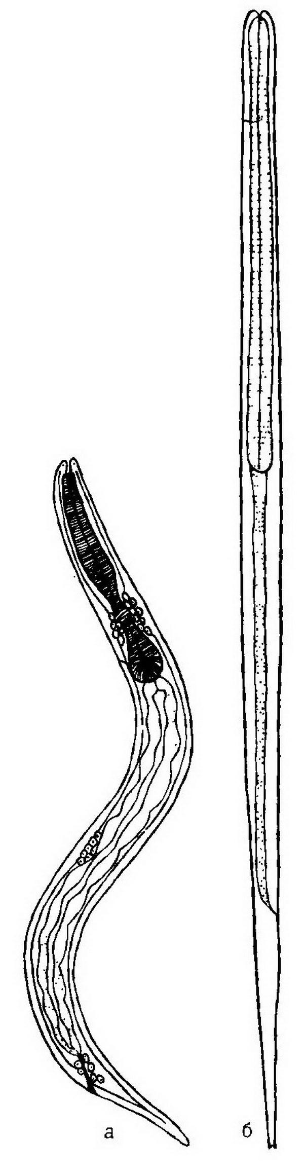Стронгилоид, или кишечная угрица (Strongyloides stercoralis) – мелкая прозрачная нитевидная нематода, раздельнополая, длина до 2–3 мм. Обитает в тонком кишечнике человека, проникая в просвет кишечных крипт (либеркюновых желез), а также желчных и панкреатических ходов. Каждая самка откладывает около 50 яиц в сутки.