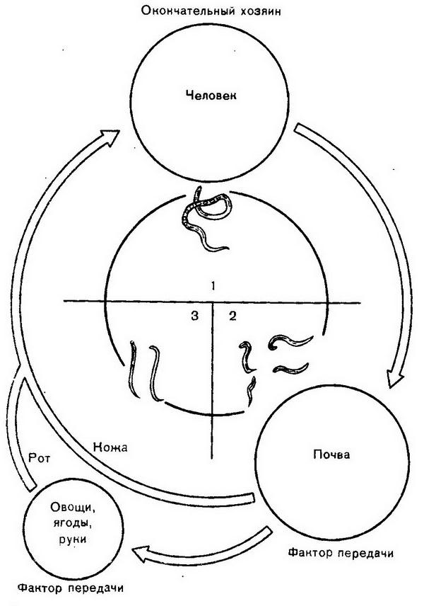 1 - половозрелые особи в организме хозяина; 2 - рабдитовидные личинки и свободноживущие поколения стронгилоида в почве; 3 - филяревидные (инвазионные) личинки, проникающие в организм человека через рот и кожу.