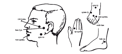 Рис. 22. Точки воздействия при зубной боли различной локализации