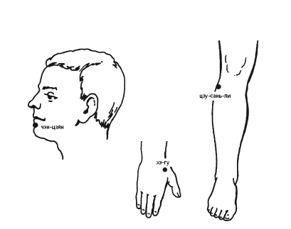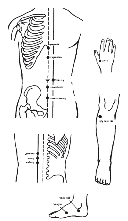 2. Одновременно сочетают воздействие на точки верхних и нижних конечностей при «наслаивающихся» заболеваниях, таких, как нарушение функции желудка и кишечника (точки хэ-гу + цзу-сань-ли).