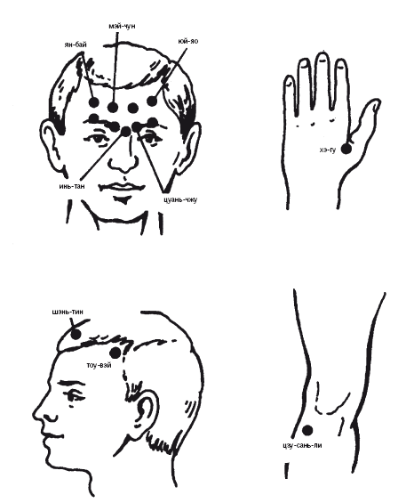Рис. 27. Точки воздействия при различной локализации головной боли