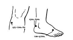 1. Воздействуют на симметрично расположенные точки – при желудочных заболеваниях сочетают точки цзу-сань-ли на обеих конечностях, при гинекологических заболеваниях – на точки сань-инь-цзяо на обеих конечностях, на симметричные точки головы тоу-вэй при лобной головной боли, на точки тянь-шу – при поносе.
