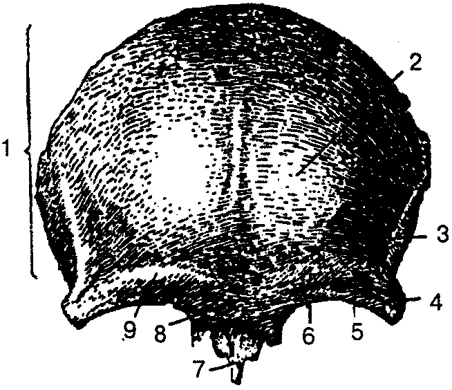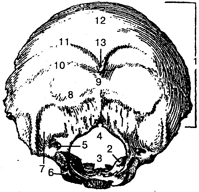 1 — затылочная чешуя; 2 — яремный бугорок; 3 — скат; 4 — большое отверстие; 5 — мышелковый канал; 6 — затылочный мыщелок; 7— мыщелковая ямка; 8— нижняя выйная линия; 9 — наружный затылочный гребень; 10— верхняя выйная линия; 11— наивысшая выйная линия; 12 — затылочная площадка; 13 — наружный затылочный выступ