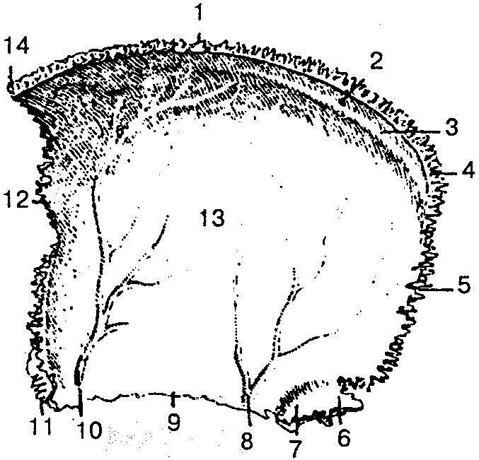 1 — сагиттальный край; 2— теменное отверстие; 3 — борозда верхнего сагиттального синуса; 4 — затылочный угол; 5— затылочный край; б—сосцевидный угол; 7— борозда сигмовидного синуса; 8—10— борозда средней менингеаль-ной артерии; 11 — клиновидный угол; 12— лобный край; 13 — внутренняя поверхность; 14 — лобный угол